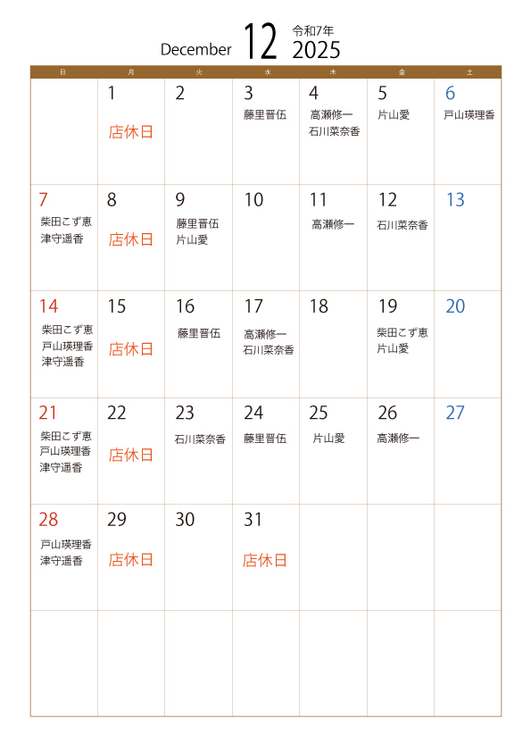 【12月の定休日とスタッフのお休みのお知らせ】